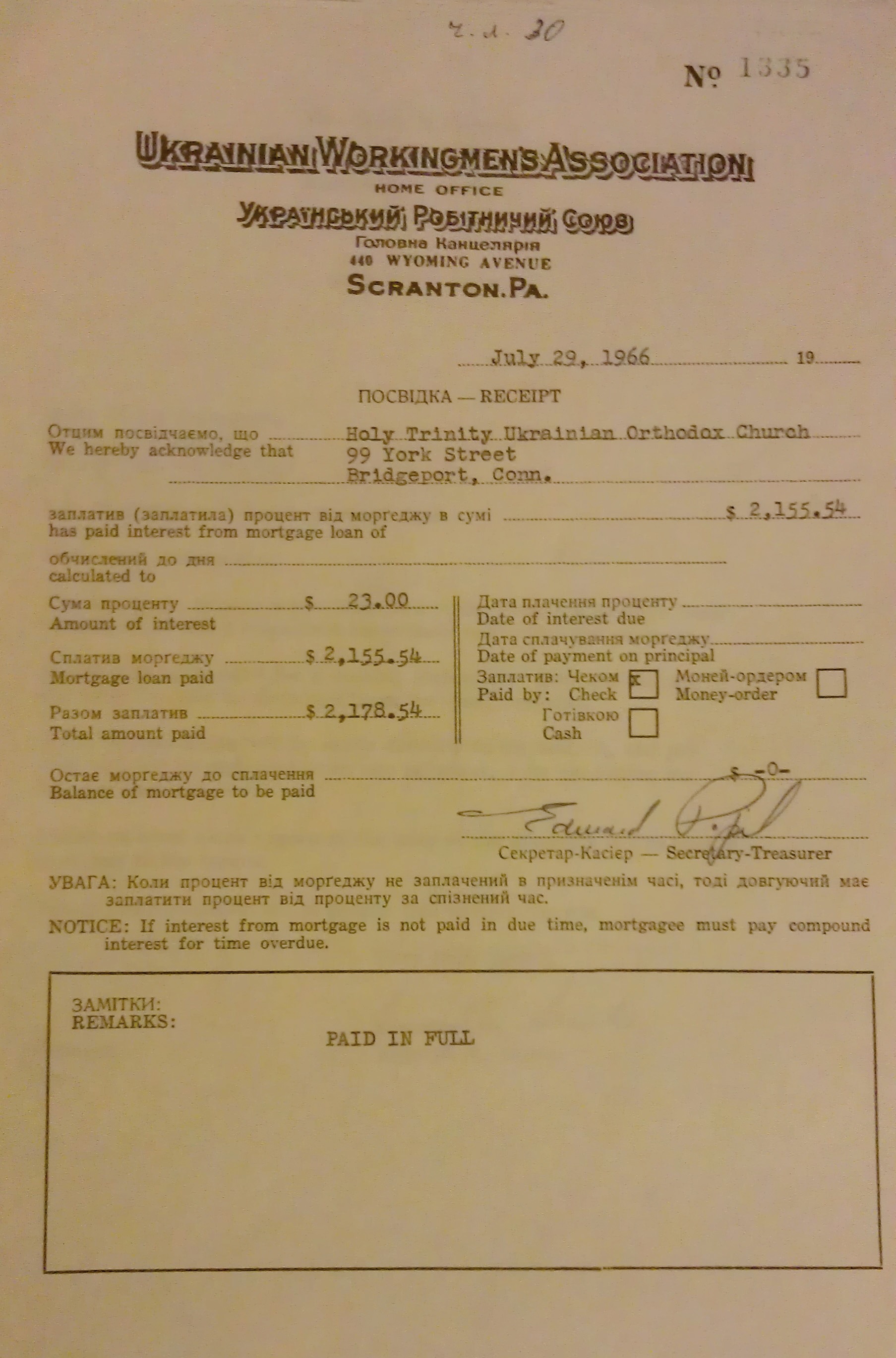Завершивши будівництво прийняли рішення одним чеком виплатити залишок заборгованості за храм. 29 липня 1966 року Свято-Троїцька парафія сплатила $2178,54, чим остаточно розрахувалася з Українським Робітничим Союзом. За американськими законами приміщення переходили у власність гро- мади лише після остаточної виплати боргу, тому свято вийшло подвійним. “Українське Православне Слово” писало: