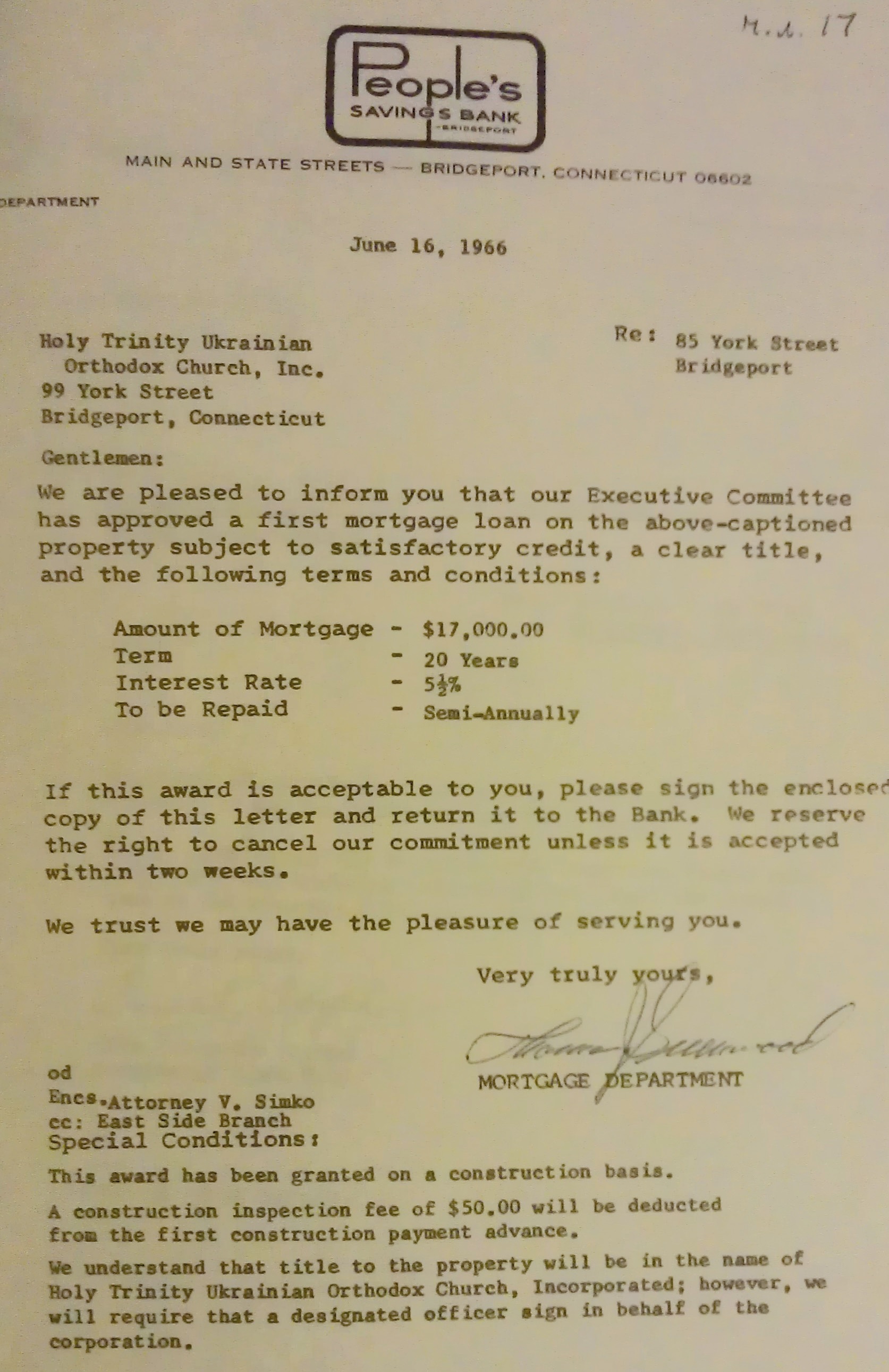 “Сьогодні я одержав прохання ініціативного Комітету з організації в м. Бриджпорт нової української православної парафії. Я не знаю, хто є головою цього ініціативного комітету, а тому відповідаю на Ваше ім’я як одного з підписаних на тому проханні… Належне полагодження Вашого прохання про відкриття нової парафії буде рішено на найближчому засіданні Консисторії нашої Церкви”.