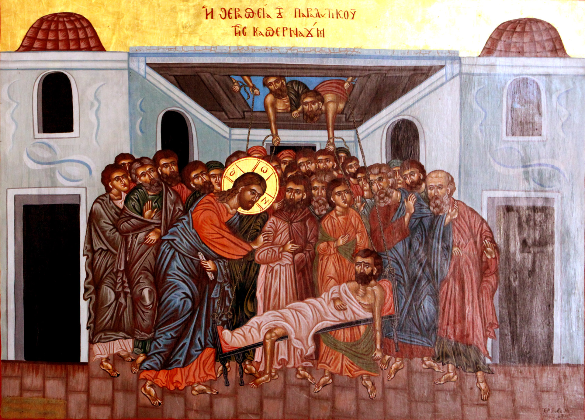 Велика кількість народу зійшлася для того, щоби побачити Христа і послухати Його проповідь. Людей було настільки багато, що не лишалося місця навіть перед домом, у якому знаходився Спаситель. Друзі паралізованого фізично не змогли зайти, бо юрба не бажала поступитися власним місцем для когось іншого.