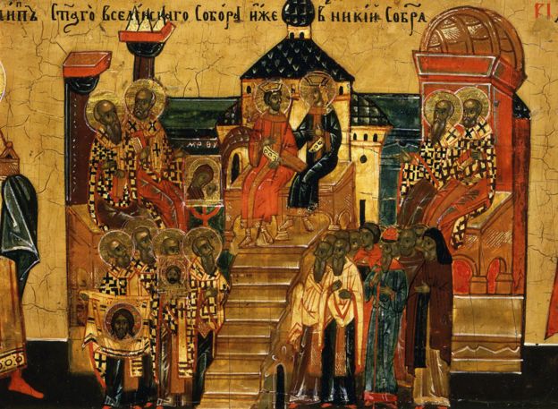 Перший Вселенський Собор протистояв єресі пресвітера Арія. Як Браун і Камерон Арій вчив, що Ісус не був Богом рівним Богу Отцю, а істотою, створеною в часі. Якщо зараз богослов’я відсунуто до сфери інтересів теологів, то в часи собору воно обговорювалося публічно, подібно, як політика і спорт сьогодні.