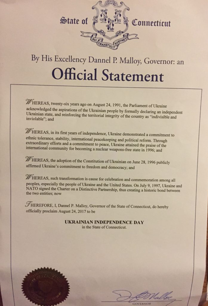 Привітання з Днем Незалежності України від Губернатора штату Конектикут