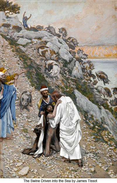 Мф.8:28-9:128 І коли Він прибув на другий бік, до країни Гергесинської, Його зустріли двоє біснуватих, що вийшли з гробниць, дуже люті, так що ніхто не міг пройти тією дорогою. 29 І ось вони закричали: що Тобі до нас, Ісусе, Сину Божий? Прийшов Ти сюди передчасно мучити нас. 30 А віддалік паслося велике стадо свиней. 31 І біси благали Його: якщо виженеш нас, то пошли нас у стадо свиней. 32 І Він сказав їм: ідіть. І вони, вийшовши, пішли у стадо свиней. І ось усе стадо кинулося з кручі в море і втопилось у воді. 33 Пастухи ж побігли у місто, розповіли про все і про те, що було з біснуватими. 34 І ось усе місто вийшло назустріч Ісусові; і, побачивши Його, просили, щоб Він відійшов від їхнього краю.